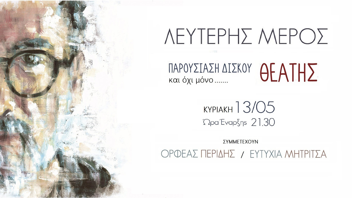 Τέσσερα χρόνια μετά το “ΚΑΤΑ ΒΑΘΟΣ” που αγαπήθηκε από τα ραδιόφωνα, o Λευτέρης Μέρος, την Κυριακή 13 Μαΐου, ανεβαίνει στην σκηνή για να παρουσιάσει τα τραγούδια του από το νέο του δίσκο με τον τίτλο «ΘΕΑΤΗΣ», σε μουσικές δικές του και στίχους του ιδιαίτερου στιχουργού Φάνη Καββαδά, αλλά και τραγούδια από τις δύο παλαιότερες δουλειές του, καθώς και αγαπημένες διασκευές με εκλεκτούς καλεσμένους: τον Ορφέα Περίδη, την Ευτυχία Μητρίτσα, και τη Βιολέτα Ίκαρη.
